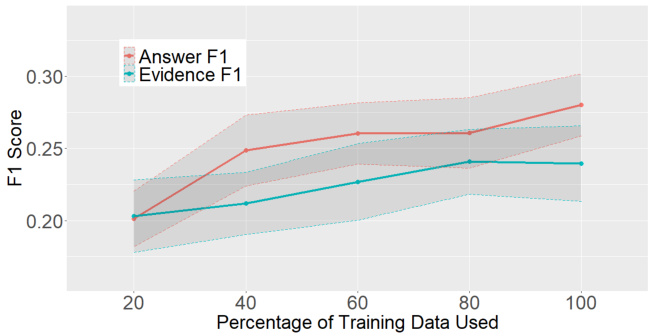 Varying amounts of training Figure 2 shows the learning curve that measures the validation Answer- $\cdot F_{1}$ and Evidence- $F_{1}$ of the LED-base vari- ants based on training data size. The learning curve suggests that performance has not reached a plateau, and future data collection could be useful.