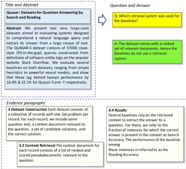 图 1: 取自QASPER的示例实例。仅阅读标题和摘要后撰写的论文相关问题。为得出答案,需寻找可能分散在多个段落中的相关证据。本例中,要回答关于"baselines"的问题,读者必须从第3节和第4节的证据中意识到"context documents"在数据集中已预先排序,而论文的"baselines"从这些"context documents"中进行选择。