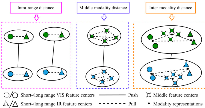 To mitigate the intra-class difference and inter-class discrepancy, we propose the MRIC loss to improve feature representations and reduce the distances between the VIS, IR, and middle features. The MRIC loss consists of three items: an intra-range loss, a middle feature loss, and an intermodality loss based on the identity centers. The illustration of the MRIC loss is shown in Figure 2.