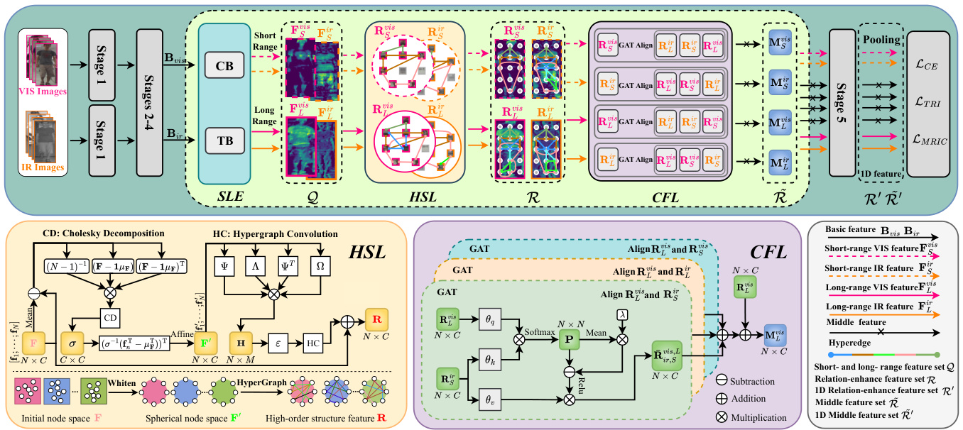 Specifically, given a VIS-IR image pair, the SLE module (consisting of a convolutional branch and a Transformer branch) extracts short-range and long-range features. Then, the HSL module models the dependence on short-range and long-range features based on a whitened hypergraph. Finally, the CFL module learns a common feature space by generating and leveraging middle features. In the CFL module, instead of directly adding or concatenating features from different modalities and ranges, we leverage graph attention to properly align these features, obtaining middle features. Based on it, a modality-range identity-center contrastive (MRIC) loss is developed to reduce the distances between the VIS, IR, and middle features, smoothing the process of learning the common feature space.