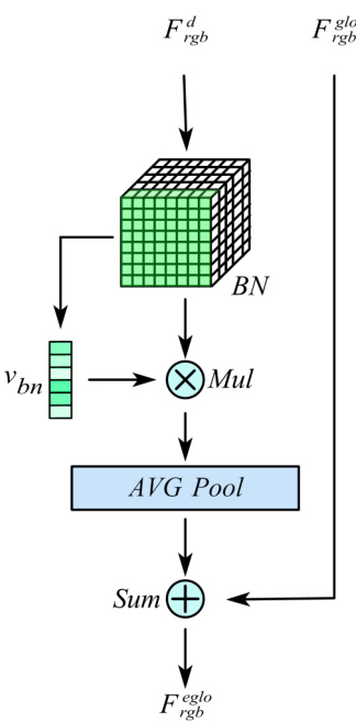 Firstly, the unified spatial output features F rdgb are normalized through the batch-normalization layer (BN) At the same time, the vector $v_{b n}$ is calculated according to the BN weights. Normalize the features F rdgb using BN and multiply them with $v_{b n}$ to obtain a new feature and use this feature to obtain a new weight matrix by adaptive averaging pooling layer. To obtain the final F reggblo , we linearly sum F rgglbo and this feature.