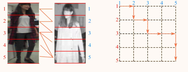 When pedestrian occlusion occurs, it is difficult to truly recognize the global pedestrian features using missing components as distinguishing features. Therefore, we designed the shortest path alignment module based on local features, which achieves component alignment by equalizing the image segmentation and calculating the shortest path between local features in the two graphs.