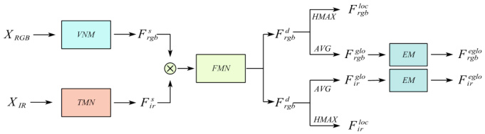 As shown in Fig. 3, We will introduce how to obtain the feature of sample. Assume that the visible and infrared image are respectively defined as $X_{r g b}$ and $X_{i r}$ , they are respectively fed into the VMN and TMN networks for feature learning to obtain shallow features $F_{r g b}^{s}$ and $F_{i r}^{s}$ ,then the two shallow features are connected as new features, which are input into the FMN network for fusion feature learning and feature mapping , and then the segmented features F rdgb and F idr represented in a uniform feature space are obtained. The segmentation features are processed by the adaptive average pooling layer to obtain the global featuresF rgglbo rgb’ , $F_{i r}^{g l o}$ ,while the local features $F_{r g b}^{l o c}$ and $F_{i r}^{l o c}$ are obtained via the horizontal adaptive maximum pooling layer. Finally, the global features are enhanced by the EM module to get the enhanced features $F_{r g b}^{e g l o}$ and $F_{i r}^{e j l o}$ .In the network inference stage, the distance matrix is constructed using the F eglo for similarity analysis.