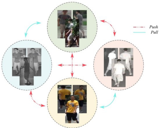 D ERSON re-identification(Re-ID) [1]is an important technology in video tracking, which mainly studies matching person images from different camera perspectives. The traditional Re-ID mainly focuses on the visible modality, but in the actual application environment, there are often problems that cannot be identified due to low illumination, so that full-time tracking cannot be realized. In order to obtain the information of pedestrian identification at night, researchers turned to VT-Reid [2]research which mainly studies the matching of pedestrian images from one modality (infrared) to another modality (visible), which is a cross-modal tracking technology for intelligent tracking of pedestrians in full time.