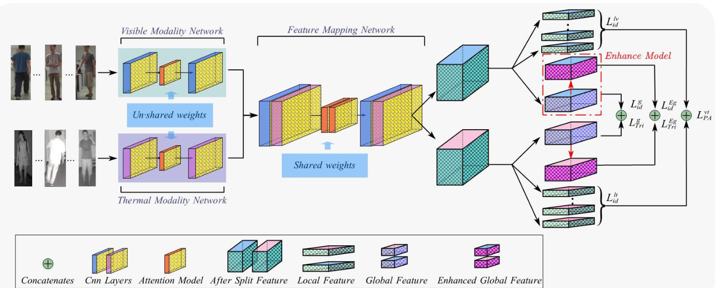 On the contrary to single stream network, the two-stream can extract different modal features by using the parallel network, so that the network has the advantage of extracting distinguishing features. Ye [10] et al. applied the two-stream AlextNet network to gain the dual-mode features, and then project these features into the public feature space. Based on this, Jiang [11]et al. designed a multi-granularity attention network to extract coarse-grained features separately. Ran [12]et al. mapped global features to the same feature space and added local disc rim i native feature learning and the algorithms performance were improved to some extent.To verify the effect of the network flow structure to acquire features ability on the performance of the algorithm, Emrah Basaran [13]designed a four-stream ResNet network framework which composed of gray flow and LZM upon the two-stream network. However, the experiment result showed that this method has large amount of calculation, high training cost and unsatisfactory experimental results. Overall, the two-stream network performs best in the structure of VT-ReID tasks.