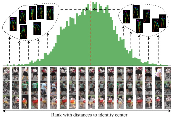 ReID framework that fully leverages capabilities of existing models by mitigating feature noise to enhance identity represent ation. During training, features of the same identity are constrained by the loss function and naturally aggregate around an ”identity center” in the feature space. Particularly, according to the central limit theorem, when the number of samples is sufficiently large, these features would follow a normal distribution with identity center as the mean. As shown in Fig. 2, we visualize the feature distribution of an identity, and rank samples of the same identity with distance to their identity center. Therefore, we introduce the concept of feature centralization. To make each sample’s feature more representative of its identity, by aggregating features of the same identity, we can reduce the noise in individual samples, strengthen identity characteristics, and bring each feature dimension closer to its central value.