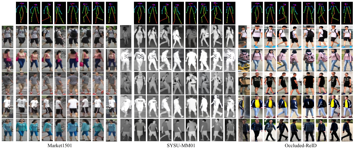 然而,在没有身份标签的情况下获取同一身份的不同样本十分困难。随着生成模型的发展,生成不同姿态的同一身份图像已成为可能。先前基于GAN的研究[13, 43, 72, 73]受限于生成效果,主要作为训练数据扩充手段。随着扩散模型在图像生成领域的突破[2, 19, 66],如今已能生成高质量、多姿态的同一人物图像。但这些方法对身份特征缺乏有效控制,生成的行人图像易受背景或遮挡干扰,难以保证跨姿态的身份一致性。为此,我们利用ReID的身份特征,提出身份引导的行人生成范式。在身份特征引导下,我们生成具有高度身份一致性的高质量图像,适用于多场景(可见光、红外及遮挡情况)。