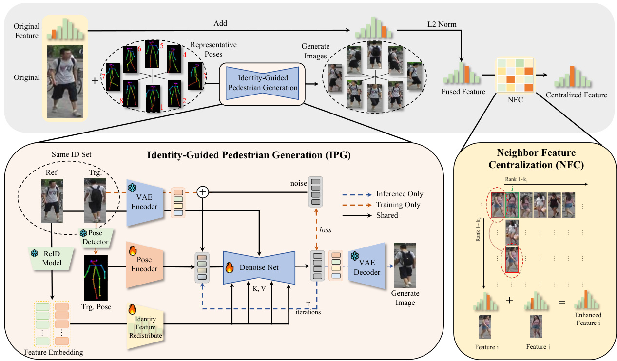 Thus, the main contributions of this paper include: • Training-Free Feature Centralization framework that can be directly applied to different ReID tasks/models, even an ImageNet pretrained ViT without ReID training; • Identity-Guided Pedestrian Generation (IPG) paradigm, leveraging identity features to generate high-quality images of the same identity in different poses to achieve feature centralization; • Neighbor Feature Centralization (NFC) based on sample’s neighborhood, discovering hidden positive samples from gallery/query set to achieve feature centralization.