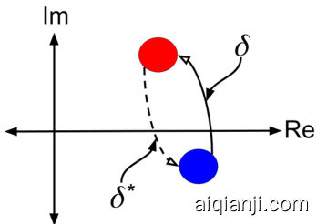 图 2: 复数空间图像旋转概念示意图。蓝色和红色圆圈分别代表查询图像和目标图像。$\delta$表示从查询文本特征学习到的复数空间旋转。$\delta^{*}$表示复数空间旋转的共轭复数。
