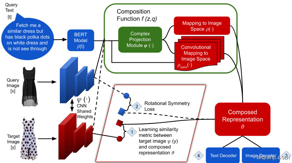 图 3: ComposeAE架构:使用文本和图像查询进行图像检索。虚线表示计算旋转对称损失所需的连接 (参见公式12、13和14)。其中1表示 $L_{B A S E}$ ,2表示 $L_{S Y M}^{B A S E}$ ,3表示 $L_{R I}$ ,4表示 $L_{R T}$
