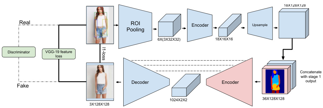 Fig. 6. Architecture of the stage 2 module. The texturing module is trained in a self supervised manner. The shape information input to the encoder is obtained from clothing segmentation and the texture information is obtained using