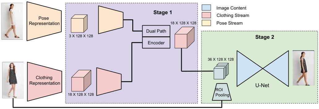 Fig. 3. Our pipeline consists of two stages: (1) the warping stage, which generates a clothing segmentation consistent with the desired pose and (2) the texturing stage, which uses clothing information from desired clothing image to synthesize detailed clothing texture consistent with the clothing segmentation from the previous stage.