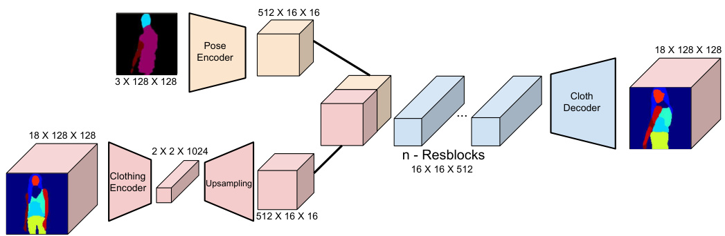 We use a dual path [28] network to address the dual conditioning problem. The dual path network consists of two streams of encoders, one for the body and one for the clothing, and one decoder that combines the two encoded hidden representations to generate the final output. We represent the clothing with a 18- channel segmentation mask where we exclude small accessories such as belts or glasses. Given this 18-channel segmentation map where each channel contains the probability map of one clothing category, the cloth encoder produces a feature map of size $512\times16\times16$ ( $16\times16$ features of size 512). Given a color-coded 3- channel body segmentation, the body encoder similarly produces a feature map of size $512\times16\times16$ to represent the target body. These encoded feature maps are concatenated and passed through 4 residual blocks. The resulting feature map is then up-sampled to generate the desired 18-channel clothing segmentation.
