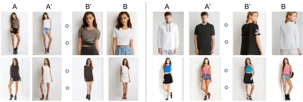 Visual analogies. There has been recent interest in visual analogy pipelines which synthesize an image by inferring the transformation between a pair of images and then applying that transformation to a new image. The work by Reed et al. [36] generates the analogous image for a particular input instance given the relationship between a similar pair of images. They show good generation results on simple 2D shapes, 3D car models and video game sprites. The more recent work by Liao et al. [37] presents a framework that, given two images, A and B’, generates two additional images A’ and B, such that each input and output image form an analogical pair (A, A’) and (B, B’). Our work is similar in spirit to this work in that, given two full-body images of people in clothing, we can transfer the clothing between the pair of images. However, our formulation is more challenging, as the system has to reason about the concept of clothing explicitly.