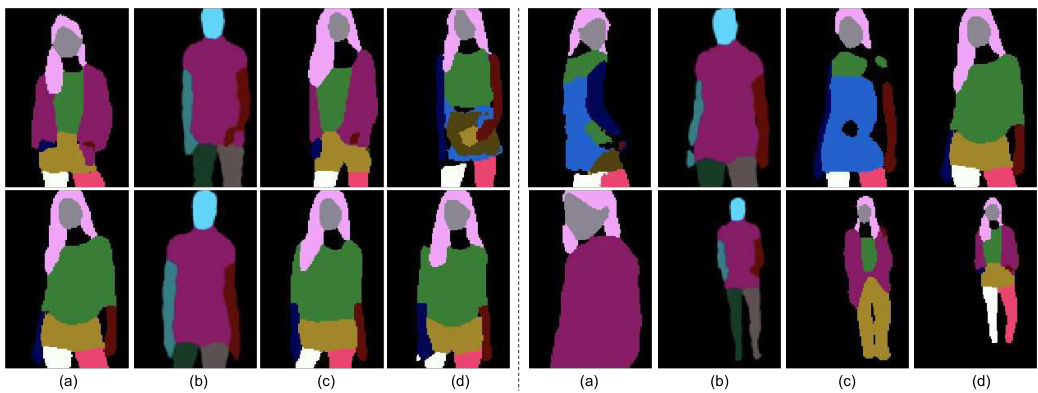 Fig. 5. Stage 1 segmentation visualization. (a) Clothing segmentation of A; (b) Body segmentation of B; (c) Generated clothing segmentation for B by warping module; (d) Original clothing segmentation of B.