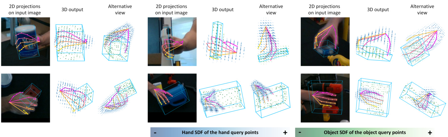 图 3: DexYCB测试集上中间查询点的可视化效果。查询点的深浅反映了预测距离(蓝色为手部表面,绿色为物体表面)。中间SDF表征能够捕捉真实的三维手部和物体形状。HOISDF有效利用SDF提供的全局鲁棒线索,成功处理各类物体、手部运动及其相互遮挡情况。