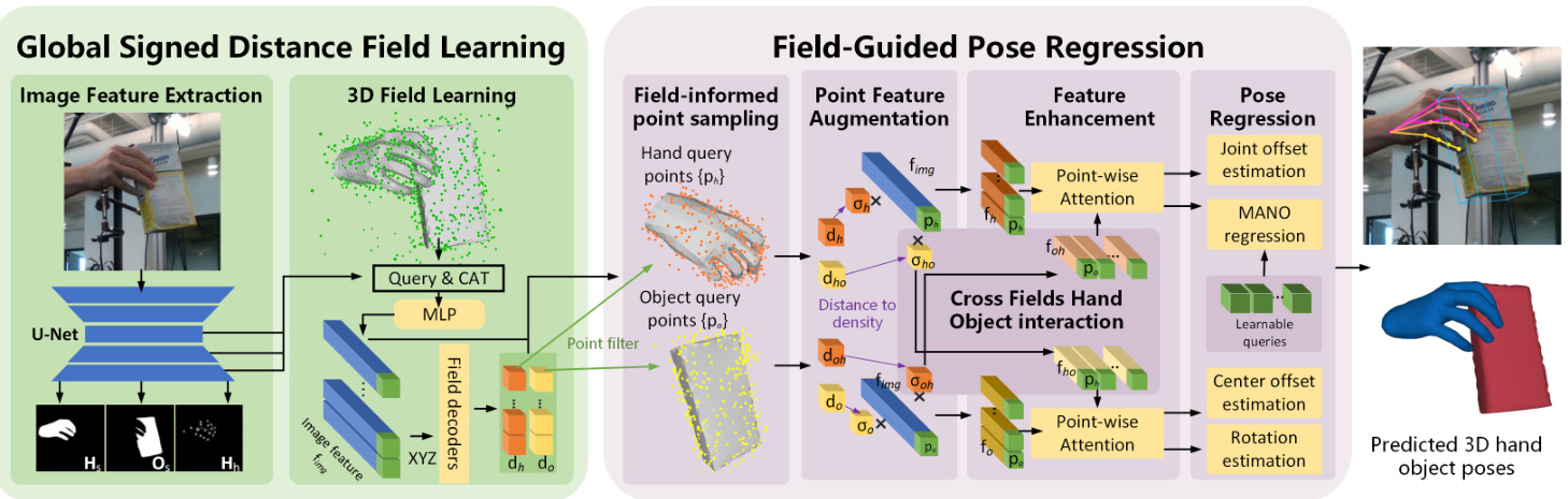 图 2: HOISDF的整体流程。HOISDF包含两个部分:全局符号距离场学习模块和场引导姿态回归模块。全局符号距离场学习模块通过隐式场学习将手-物符号距离回归为中间表示,并将3D形状信息编码到图像主干中。场引导姿态回归模块利用全局场信息过滤增强点特征,并指导手物交互。这些增强后的点特征随后通过逐点注意力机制回归手部和物体姿态。