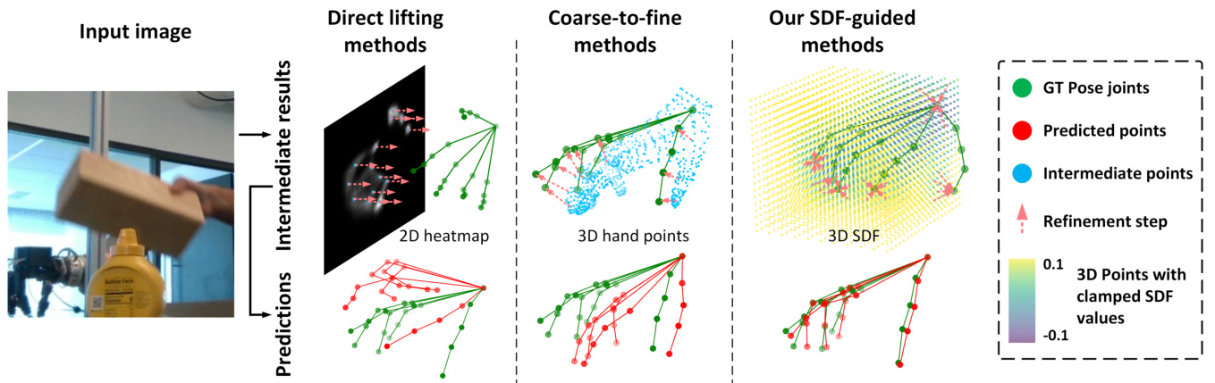 图 1: SDF引导模型相对于现有方法的概念优势。我们的模型利用有向距离场 (Signed Distance Fields, SDF) 为手-物体姿态估计提供全局且密集的约束。与直接提升和由粗到细的方法相比(这些方法难以优化较差的初始预测),距离场提供的全局线索不受限于初始预测附近的区域。