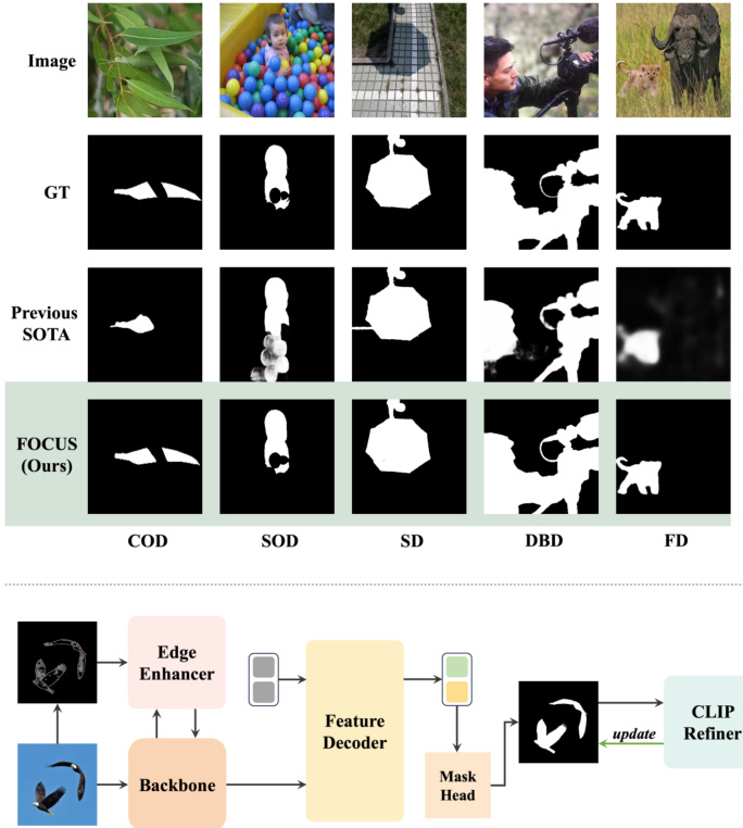 图 1: FOCUS 通过单一统一架构处理多种前景分割任务。我们提出的方法能生成边界感知掩码,相比之前最先进的专用任务模型更加平滑细致。放大查看细节。