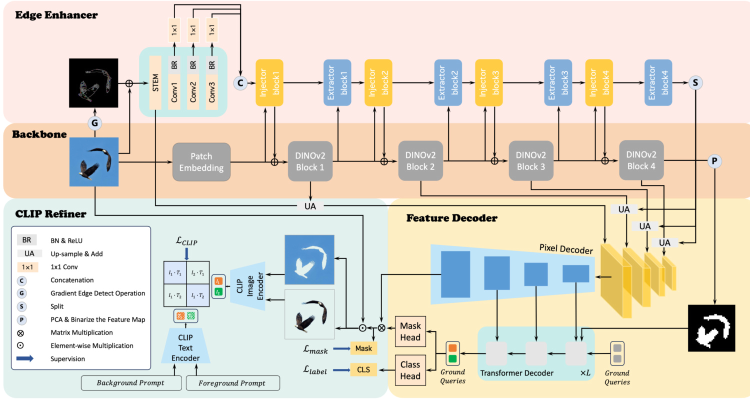 Here $I_{\mathrm{f}},I_{\mathrm{b}},T_{\mathrm{f}},I_{\mathrm{b}}\in\mathbb{R}^{2\times S}$ denotes the $S$ -dimensional image feature and text feature of foreground and background obtained by CLIP, $\tau$ is temperature parameter used to control the smoothness of the softmax function. The CLIP refiner iteratively refines the edges of masks generated by the preceding module, ensuring that only the appropriate pixels are included in the foreground or background. This process aligns the mask-fused image more closely with the corresponding text in the feature space while distancing it from the mismatched one. This not only makes the mask edges more accurate but also widens the gap between the foreground and background. The CLIP refiner is only used to distill knowledge from CLIP and will be discarded during the inference stage. Additionally, we keep the image and text encoders entirely frozen to fully leverage the multi-modal capabilities of CLIP without the potential performance degradation that might arise from fine-tuning.