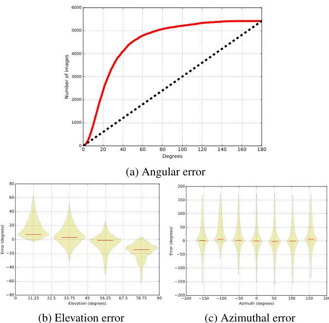 Figure 4. Quantitative evaluation of sun position estimation on all 8659 images in the SUN360 test set. (a) The cumulative distribution function of the angular error on the sun position. The esti- mation error as function of the sun elevation (b) and (c) azimuth relative to the camera (  $0^{\circ}$   means the sun is in front of the camera). The last two figures are displayed as “box-percentile plots” [10], where the envelope of each bin represents the percentile and the median is shown as a red bar.