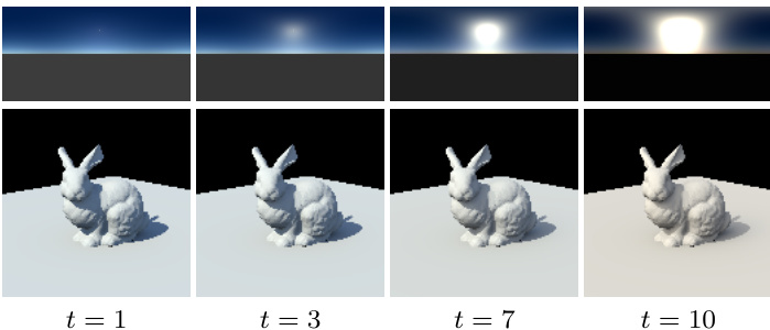 Figure 2. Impact of sky turbidity  $t$   on rendered objects. The top row shows environment maps (in latitude-longitude format), and the bottom row shows corresponding renders of a bunny model on a ground plane for varying values for the turbidity  $t$  , ranging from low (left) to high (right). Images have been tonemapped with  $\gamma=2.2$   for display.