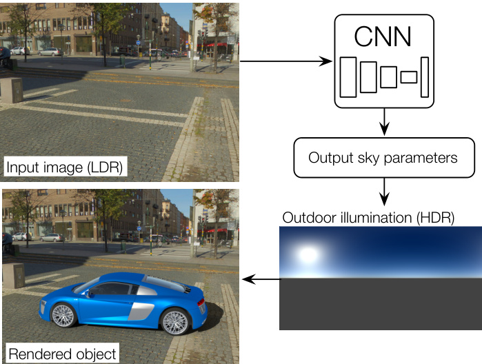 我们提出了一种基于CNN(卷积神经网络)的技术,用于从单张低动态范围图像中估算高动态范围的户外光照。为了训练CNN,我们利用了一个大型户外全景图数据集。通过将低维物理基础的户外光照模型拟合到这些全景图的天空部分,我们得到了一组紧凑的参数(包括太阳位置、大气条件和相机参数)。我们从全景图中提取有限视场的图像,并利用大量输入图像-输出光照参数对来训练CNN。给定测试图像时,该网络可用于推断光照参数,进而重建户外光照环境贴图。我们证明,该方法能够恢复合理的光照条件,并实现从单张图像中进行照片级真实感的虚拟物体插入。对全景图数据集和捕获的HDR环境贴图进行的广泛评估表明,我们的技术显著优于该问题的先前解决方案。