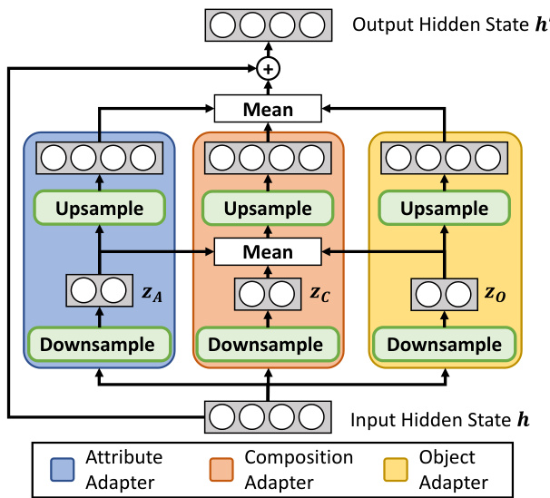 我们进一步将 $\mathbf{h_{C}^{\prime}}$ 与属性和对象适配器的输出 $\mathbf{h_{A}^{\prime}}$ 和 $\mathbf{h}_{\mathbf{O}}^{\prime}$ 结合,生成最终输出: