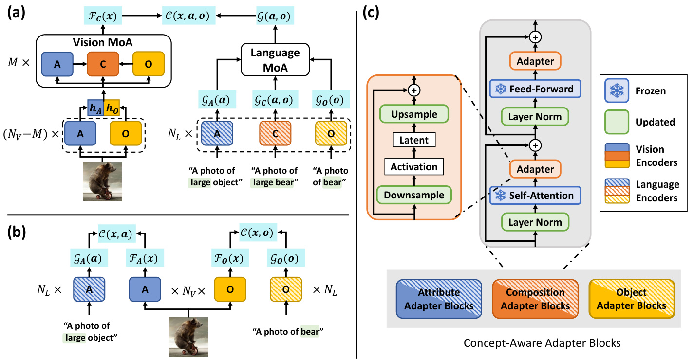 On the vision side, we perform a two-stage feature extraction. As shown in Fig. 2 (a), for the first $N_{V}-M$ layers, we extract features related to the attribute $(\mathbf{h}{A})$ and the object $(\mathbf{h}{O})$ through corresponding encoding blocks, which are further concatenated and processed by the trailing $M$ ternary MoA layers. An example of the vision MoA layer is shown in Fig. 3. Given the hidden state $h$ , we extract latent features $\mathbf{z}{\mathbf{A}},\mathbf{z}{\mathbf{O}}$ and $\mathbf{z}{\mathbf{C}}$ from the adapters. We then combine all three features and create $\mathbf{z_{C}^{\prime}}$ , followed by $f_{U p}$ :