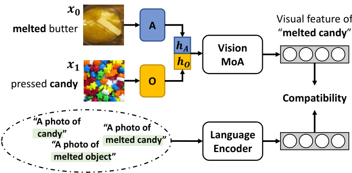 Fig. 4 demonstrates the process of concept shift: Given one sample $x_{0}$ of melted butter and one sample $x_{1}$ of pressed candy, we create a new sample of melted candy in the feature space, by combining the attributeoriented feature $\mathbf{h}{A}$ of $x_{0}$ and the object-oriented feature $\mathbf{h}{O}$ of $x_{1}$ . The newly combined feature is further processed by vision MoA layers described in Sec. 3.3, leading to an embedding representing melted candy. Such change can be viewed as an “object shift” from melted butter or an “attribute shift” from pressed candy. Thus, we name this process “primitive concept shift”. In practice, we randomly pick a proportion of samples for shifting and ensure that the new label after shifting still lies in the training set. We discuss the effectiveness of the shifting in Sec .4.3.