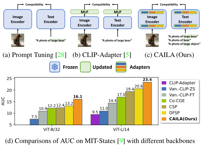 Though CLIP-based CZSL approaches [5, 28, 48] have achieved significant improvements compared with earlier methods [22, 24, 25, 28, 31], the CLIP encoder is considered as a black box and no modifications are made to improve its general iz ability. Thus, we propose to improve CLIP-based CZSL models in both modalities with CAILA , ConceptAware Intra-Layer Adapters.