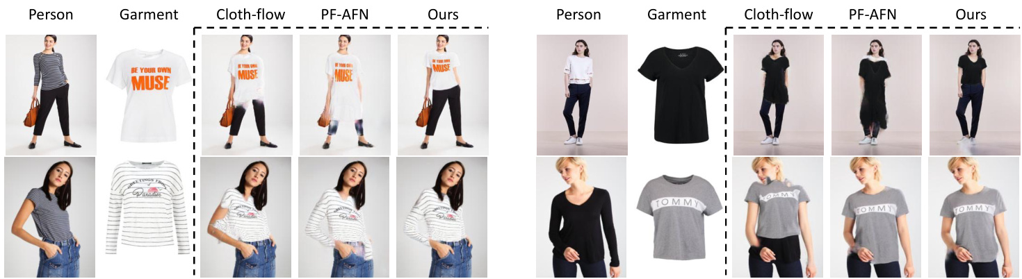 Our method is also a parser free method. However, our method focuses on the design of the garment warping part, where we propose a novel global appearance flow based garment warping module.