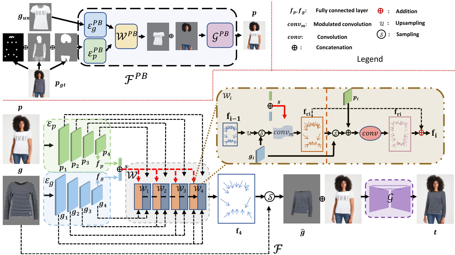 where $c o n v_{m}$ denotes modulated convolution [21], $S(\cdot,\cdot)$ is the sampling operator, $\mathcal{U}$ is the upsampling operator, and $\mathbf{f_{i-1}}\in\mathbb{R}^{2\times h_{i-1}\times w_{i-1}}$ is the predicted flow from last warping block. Note that the first block $\mathcal{W}{1}$ in $\mathcal{W}$ only takes in the lowest resolution garment feature map and the style vector, i.e., $\mathbf{f_{c1}}=c o n v_{m}(g_{N},s)$ . As can be seen from Equation 3, the predicted $\mathbf{f_{ci}}$ depends on the garment feature map and the global style vector. It thus has a global receptive field and is capable to cope with large mis-alignments between the garment and person images. However, as the style vector $s$ is a global representation, as a trade-off, it has a limited ability to accurately estimate the local fine-grained appearance flow (as shown in Fig. 5). The coarse flow is thus in need of a local refinement.