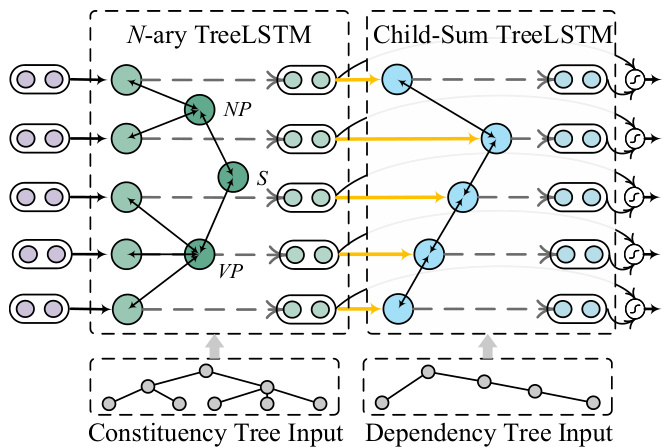 我们基于TreeLSTM的HeSyFu (Tr-HeSyFu) 由针对const.树的$N$元TreeLSTM和针对dep.树的Child-Sum TreeLSTM组成,其设计灵感来自Tai等人 (2015) 的研究。