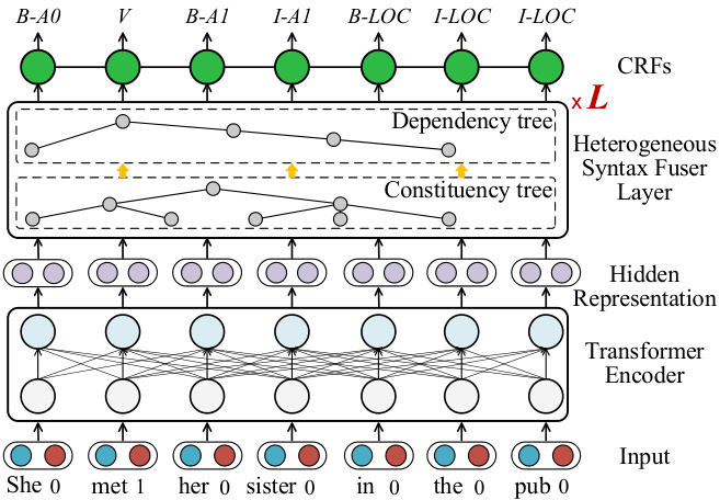 As illustrated in Figure 2, our SRL framework consists of four components, including input representations, Transformer encoder, heterogeneous syntax fuser layer and CRFs decoding layer.