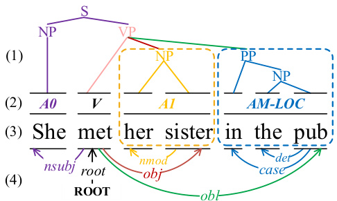 图 1: 基于 (3) 示例句子,(1) 句法成分结构和 (4) 依存结构对 (2) 语义角色标注 (SRL) 的协同增效作用。