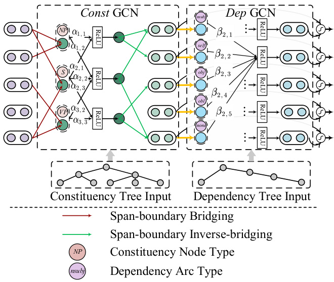 我们提出了两种神经异构语法融合器(即HeSyFu),包括基于TreeLSTM的HeSyFu(见图3)和基于标签感知GCN的HeSyFu(见图4)。HeSyFu共堆叠了$L$层以实现完整的语法交互。基于成分句法(constituency,简称const.)辅助的边界识别应先于依存句法(dependency,简称dep.)辅助的语义关系判定这一直觉,我们在架构设计上将成分编码置于依存编码之前。