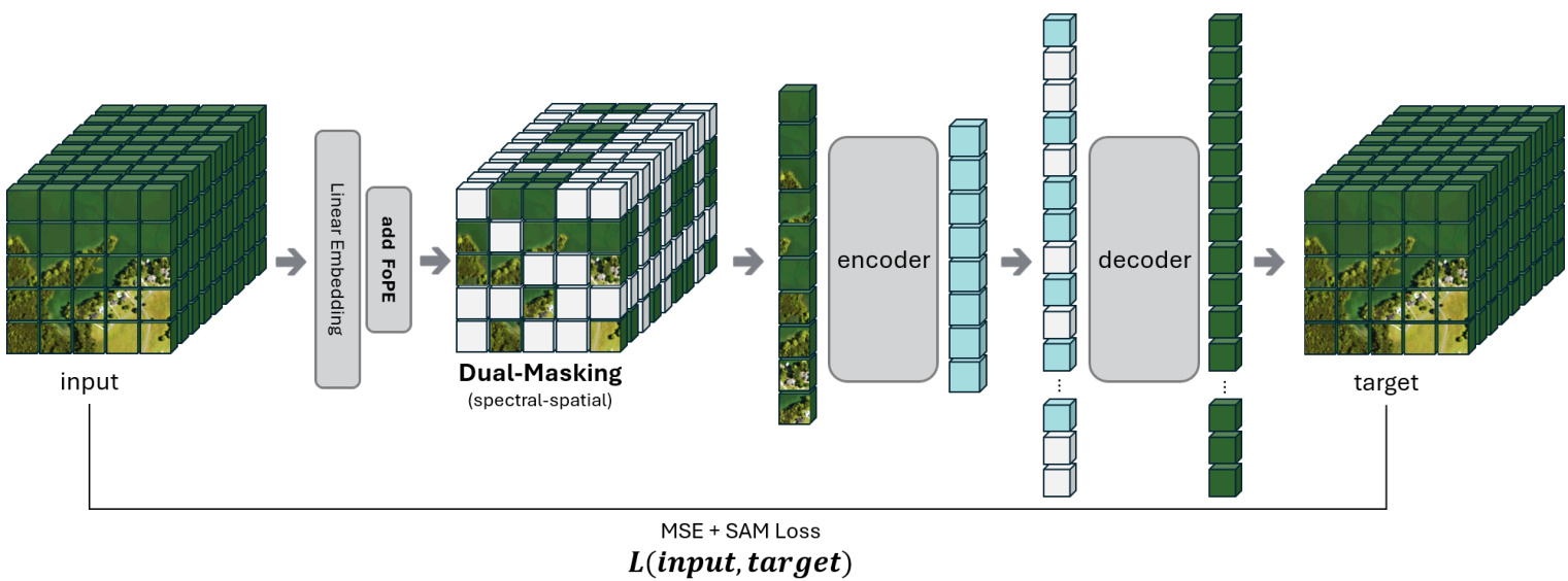 - 双重掩码策略:同时掩码空间区块和光谱波段,迫使模型捕捉跨维度依赖性 [4]。