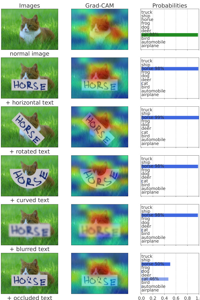 自然图像。在图1中,我们在自然图像上放置不同的文字贴纸,使用CLIP对其进行分类1,并通过Grad-CAM[19]可视化CLIP的注意力。显然,无论文字如何变化2,CLIP都对文字贴纸高度关注并准确理解单词含义。CLIP是基于从网络收集的海量自然图像训练的,其文本感知能力可能源自包含场景文字的自然图像[20]。那么CLIP能否感知常见STR图像[21][22][16]中的文字?这些图像是从自然图像中裁剪得到的。图2展示了CLIP-ViT-B/32对STR图像的可视化结果。尽管这些STR图像中的文字存在遮挡、弯曲、模糊和旋转,CLIP仍能感知它们。从图1和图2可以看出,CLIP具有感知和理解图像中各类文字的卓越能力,这正是稳健STR骨干网络所需的特质。