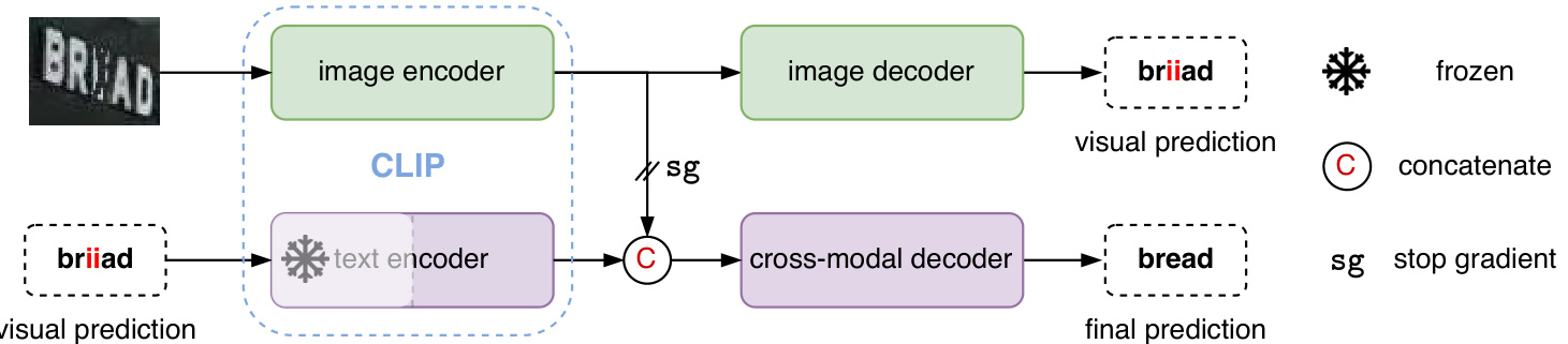 The text encoder is partially frozen. This freezing operation retains the learned text understanding ability of the language model and reduces training costs. It is a common practice in transfer learning of large language models [72]. In contrast, the visual branch is fully trainable due to the domain gap between STR data (cropped word images) and CLIP training data (collected from the web, often natural images). Additionally, we block the gradient flow from the cross-modal decoder to the visual encoder to enable autonomous learning of the visual branch, resulting in improved refined cross-modal predictions.