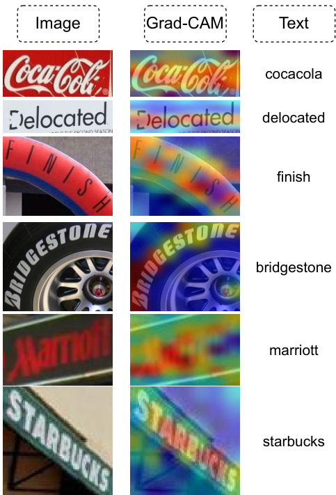 natural images. In Fig. 1, we put different text stickers on a natural image, use CLIP to classify it1, and visualize the attention of CLIP via Grad-CAM [19]. It is evident that CLIP pays high attention to the text sticker and accurately understands the meaning of the word, regardless of text variations 2. CLIP is trained on massive natural images collected from the web, and its text perception ability may come from the natural images containing scene texts [20]. Will CLIP perceive the text in common STR images [21], [22], [16], which are cropped from a natural image? Fig. 2 presents the visualization results of CLIP-ViT-B/32 for STR images. Although the text in these STR images is occluded, curved, blurred, and rotated, CLIP can still perceive them. From Fig. 1&2, we can see CLIP possesses an exceptional capability to perceive and comprehend various text in images. This is exactly the desired quality for a robust STR backbone.