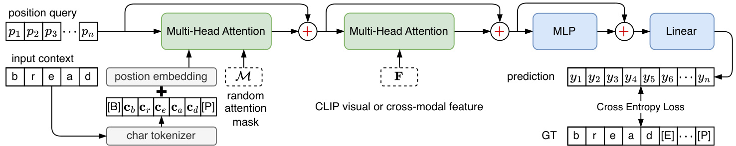 The visual and cross-modal decoders have the same architecture but differ in the input. They receive the following inputs: a learnable position query $\textbf{}\in\mathbb{R}^{N\times D}$ , an input context c ∈ RN×D, and a randomly generated attention mask $\mathcal{M}\in\mathbb{R}^{N\times N}$ . $N$ represents the length of characters. The decoder outputs the prediction $\textbf{}\in\mathbf{\bar{\mathbb{R}}}^{N\times C}$ , where $C$ is the number of character classes. The decoding stage can be denoted as: $\pmb{y}=\mathrm{DEC}(\pmb{p},\pmb{c},\pmb{\mathcal{M}},\pmb{F})$ . The first Multi-Head Attention (MHA) in Fig. 4 performs context-position attention: