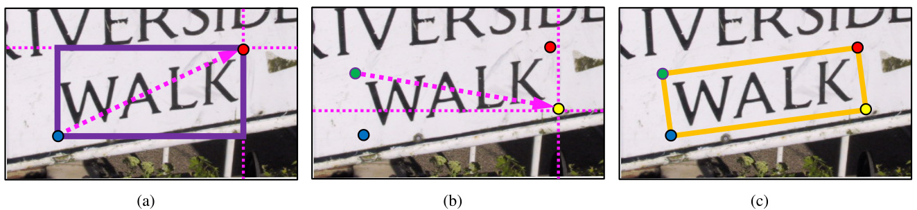 Figure 1: Annotating an instance of text: $:$ (a) The conventional way of drawing a rectangular bounding-box. Clicking on a corner (blue point) and dragging the mouse to the diagonally opposite corner (red point) to receive a rectangle (solid purple box). But the rectangular bounding-box is not very accurate for rotated text region. (b) (c) Drawing another diagonal (dashed arrow in (b)) to finish the annotation (solid orange box in (c)) for inclined text instance. Best viewed in color.