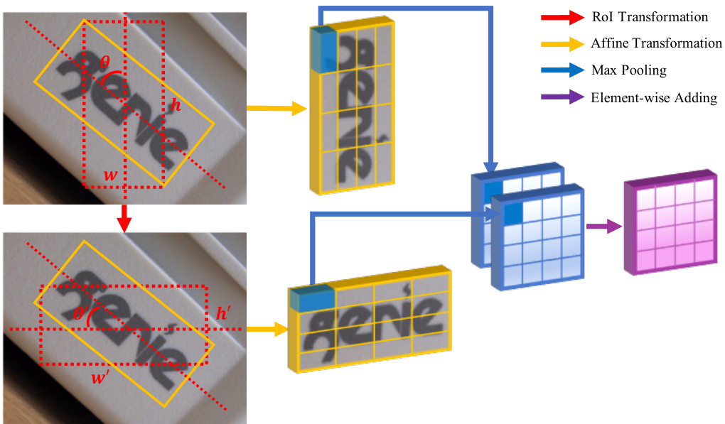 As described in Fig.3, inputting the RoI $O^{'}$ to RRoI pooling layer will obtain a totally different grid of sub-windows. We combine these two RoIs as a Dual-RoI and fuse their feature vectors to get the final output via element-wise adding operation. The essence of Dual-RoI pooling embeds multi-instance learning [28] inside the region-wise subnetwork and that will be helpful for finding the most representative features for training, similar to TI-POOLING [29]. As a result of directly conducting the transformation on feature map instead of on the source image, our module is more efficient than [29]. Considering the diversity of text arrangement, we argue that the element-wise adding is more appropriate than element-wise maximum in our task.