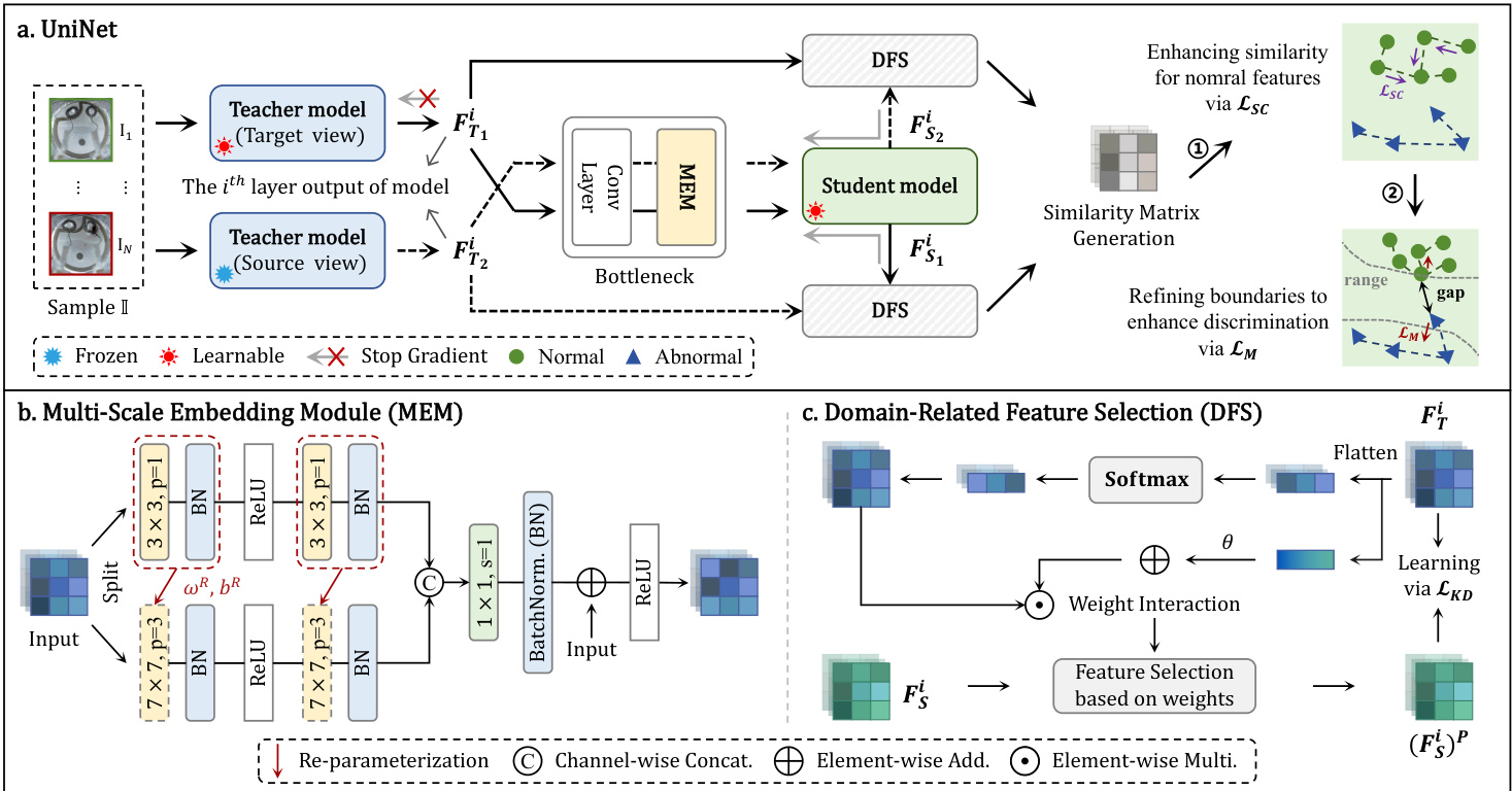To capture the contextual relationships among features, UniNet first develops a lightweight-yet-effective MEM within the bottleneck (Sec. 4.2). Then, we propose domainrelated feature selection, guiding the student to select targetoriented features from the teacher with prior knowledge and prompting its learning (Sec. 4.3). Besides, a similaritycontrastive loss is proposed to enhance the correlations among homogeneous features, followed by the development of a margin loss to preserve the distinction between the similarities of normal and anomalous features, thereby enhancing disc rim inability (Sec. 4.4). Based on the similarity between the outputs of S-T network, a weighted decision mechanism is proposed to achieve robust AD performance during inference (Sec. 4.5).