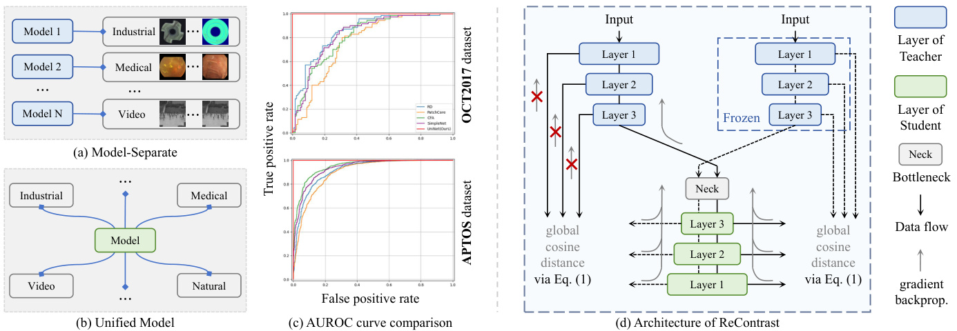 Figure 1. (a) One-model-one-domain setting. (b) One-model multi-domain setting. (c) AUROC curve comparison of UniNet and competing AD methods (reliance on pre-trained features) on medical datasets. (d) Architecture of ReContrast.