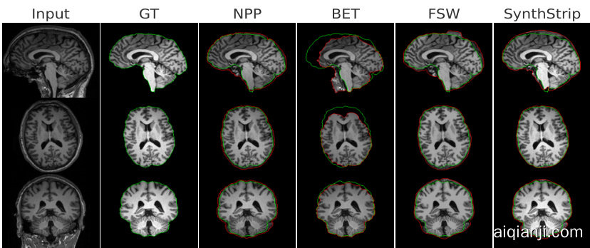 图 2: 颅骨剥离的代表性切片。从上到下:冠状面、轴向面和矢状面视图。绿色和红色轮廓分别表示真实脑掩膜和估计脑掩膜。