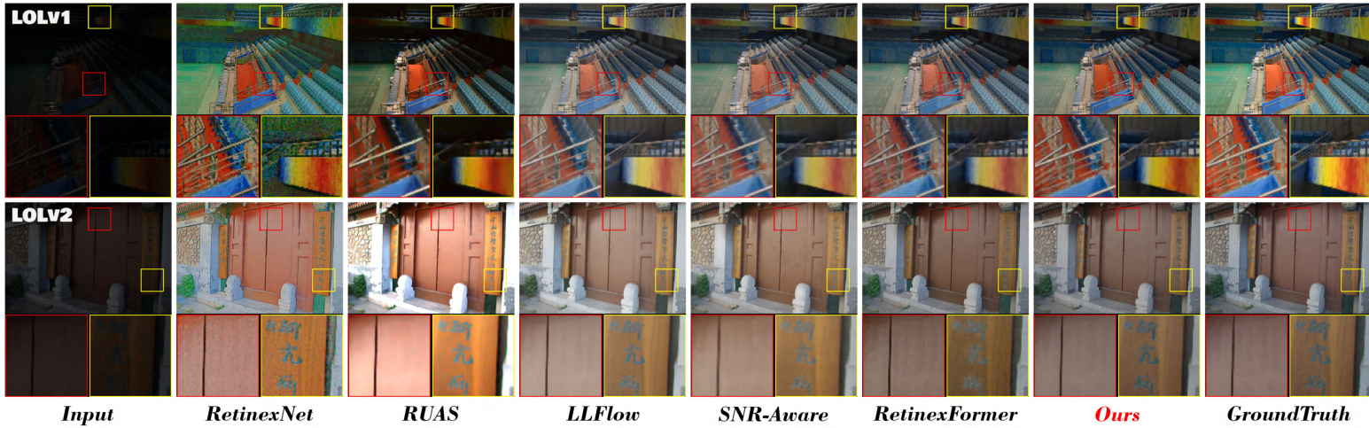 图 5: 不同方法在 LOLv1 和 LOLv2 数据集上的增强效果视觉对比。(建议放大查看最佳效果)