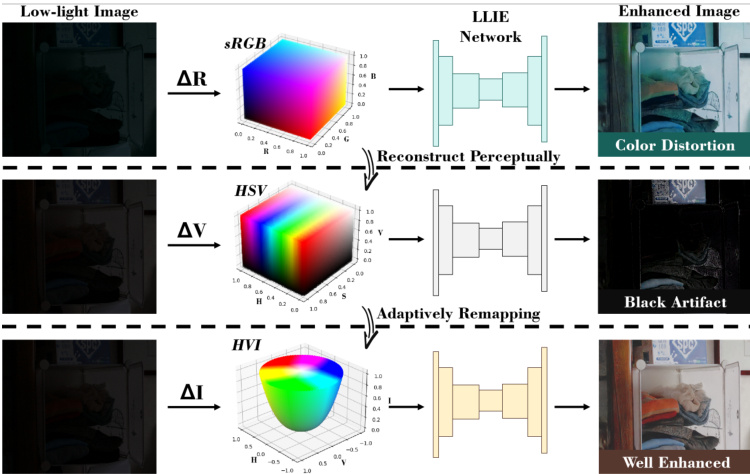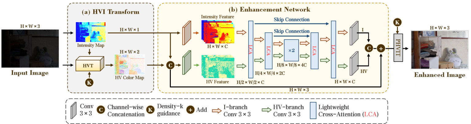 As shown in Fig. 3, the overall framework can be divided into three consecutive main steps, i.e., HVI transformation, enhancement network, and perceptual-inverse HVI transformation.