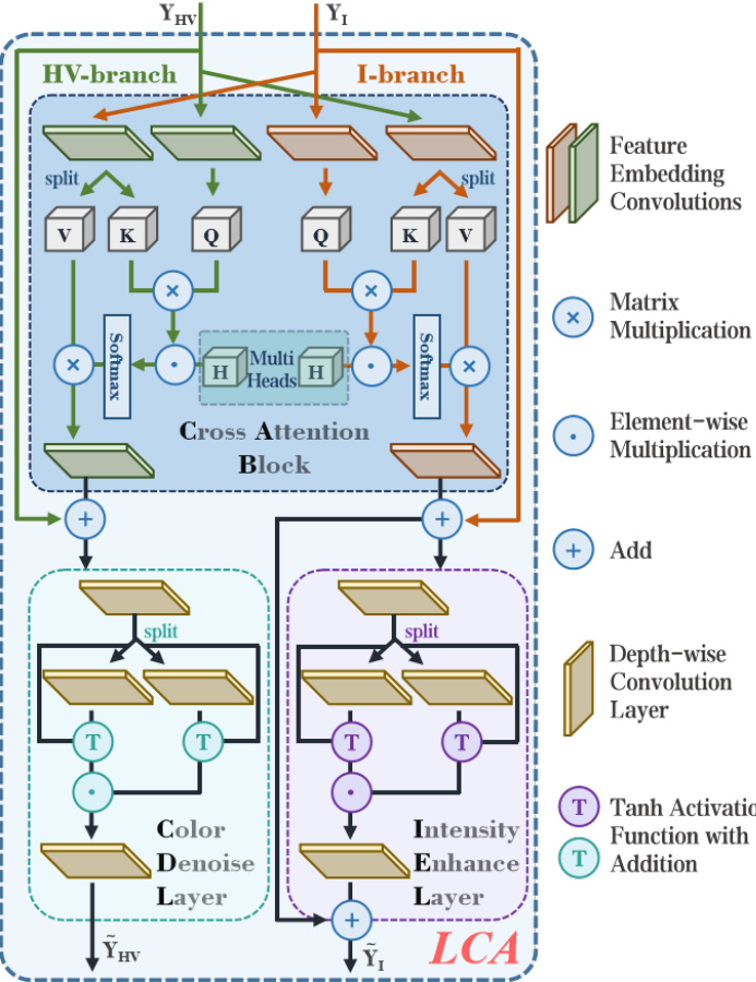 图 4: 双分支轻量化交叉注意力 (LCA) 模块 (即 I 分支和 HV 分支)。该模块包含交叉注意力块 (CAB)、强度增强层 (IEL) 和色彩降噪层 (CDL)。特征嵌入卷积层由 $1\times1$ 深度可分离卷积和 $3\times3$ 分组卷积构成。